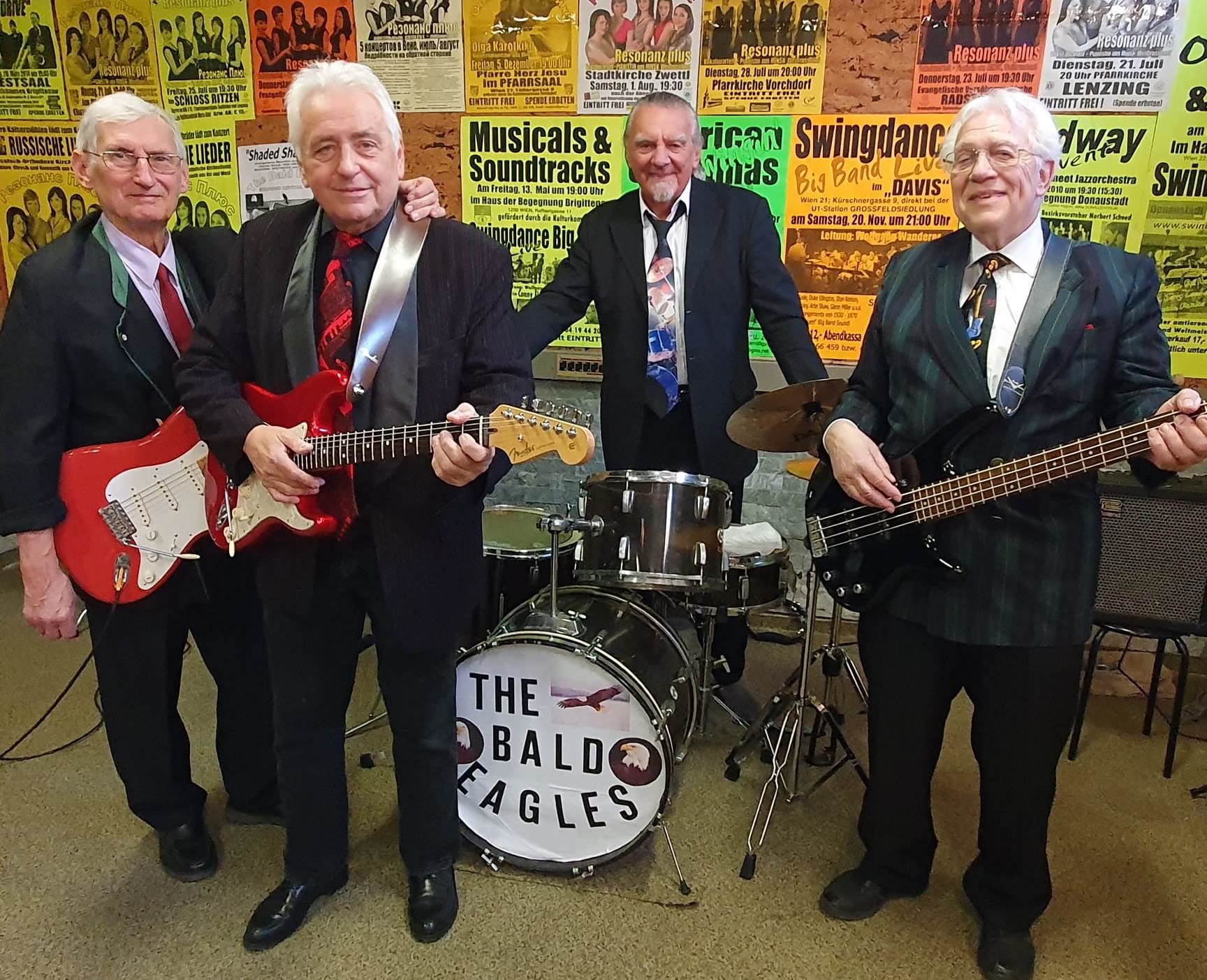 Eine neue „Boys-Group“ für den Song Contest? Mitnichten… doch die Musikgeschichte zeigt, dass die großen Popstars immer wieder „REVIVAL-Bands“ hatten, teils auch sehr gute. Die BEATLES oder ABBA haben's gezeigt, auch ELVIS PRESLEY hat hunderte Doubles, die ihn imitieren. Die BALD EAGLES haben sich einer Musik verschrieben, die etwa 5-6 Jahre lang die Teenager begeisterte – zur Zeit als die „alten Rocksänger“ Bill Haley, Little Richard, Jerry Lee Lewis, Chuck Berry… nicht mehr das Publikum von den Sitzen rissen und die BEATLES noch nicht da waren, um ihr Testosteron auf allen Bühnen zu versprühen. Da gab's die wunderbaren „GUITAR BANDS“: Die VENTURES aus Amerika, die SPOTNICKS aus Schweden, und vor allem die grandiosen SHADOWS aus England. Die Rock- und Pop-Gitarristen der damaligen Zeit waren ja nicht besonders virtuos, sie improvisierten ein bisschen und konnten kaum einige Melodietöne interpretieren. Doch diese drei genannten Bands spielten von hartem Boogie/Rock bis zu gefühlvollen Balladen ausgezeichnete Stücke: APACHE (Shadows) AMAPOLA (Spotnicks) und WALK DON'T RUN (Ventures) waren herausragende Beispiele. Die BALD EAGLES haben als 13- oder 14-jährige Buben jede Schallplatte genauestens nachgespielt und jetzt ist die Zeit reif, auch diesen Stil wieder neu aufzulegen. Wie kommt man zu diesem Namen? Der Wappenvogel der USA ist der „Bald Eagle“, übersetzt auf Deutsch heißt das heißt das eben „Weißkopfadler“. Schauen Sie sich das Band-Foto an…. noch Fragen? Nur die "Stones" sind älter ! ! ! :)